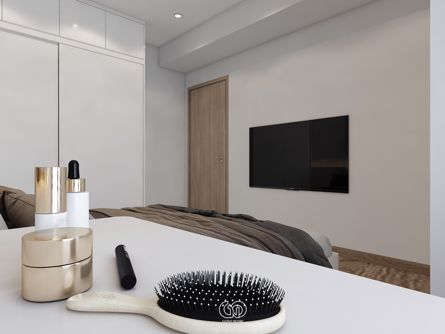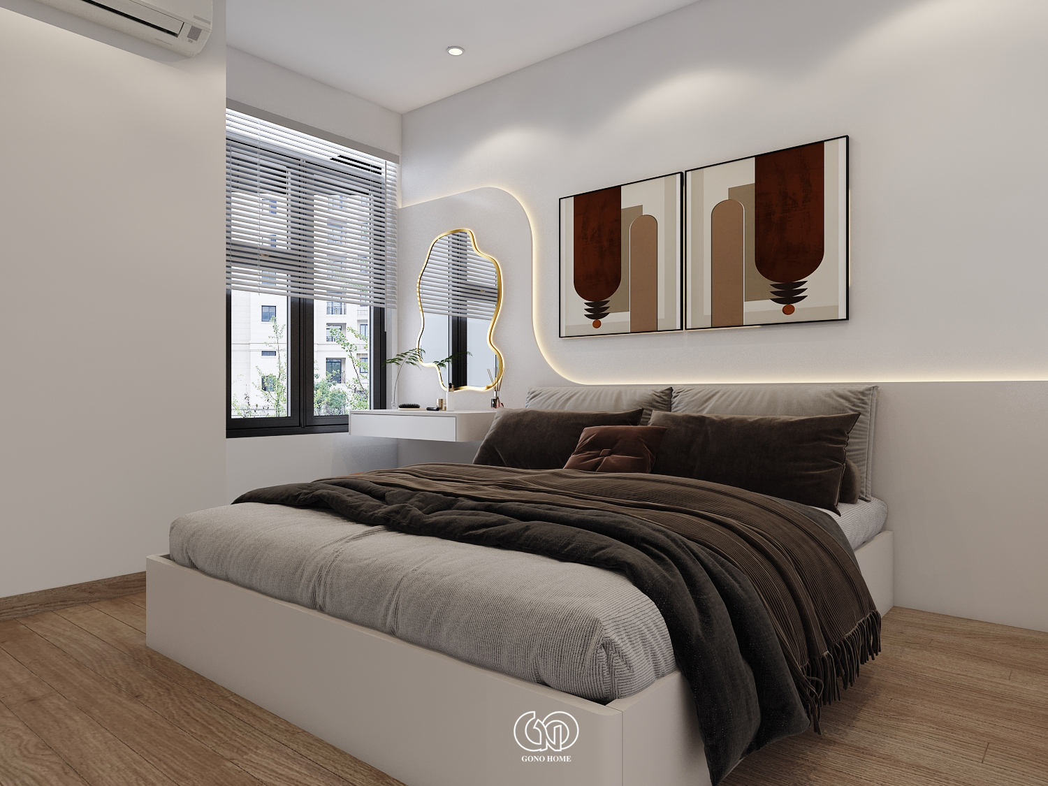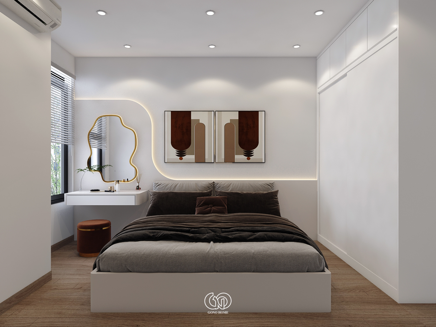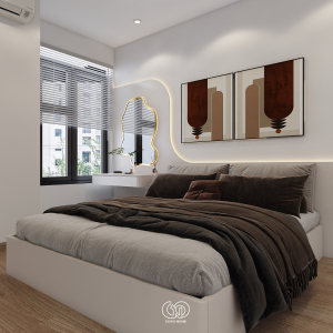 Gam màu chủ đạo là trắng – be – gỗ – cam đất, mang lại cảm giác ấm cúng, gần gũi nhưng không kém phần sang trọng.