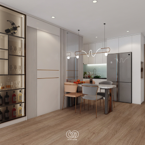 Mẫu thiết kế nội thất căn hộ này được triển khai theo phong cách hiện đại, tối giản nhưng vẫn đảm bảo tính thẩm mỹ cao. Không gian được bố trí liền mạch giữa phòng khách – bếp – khu ăn uống, tạo nên sự thông thoáng và rộng rãi.