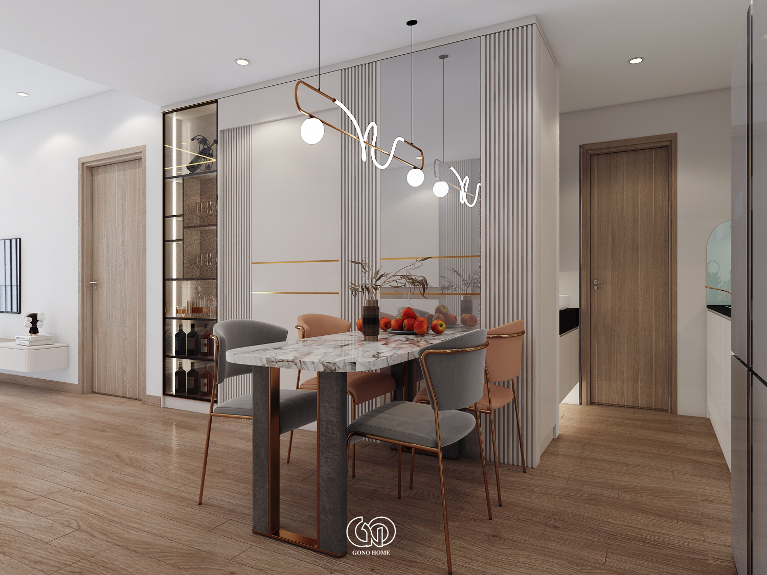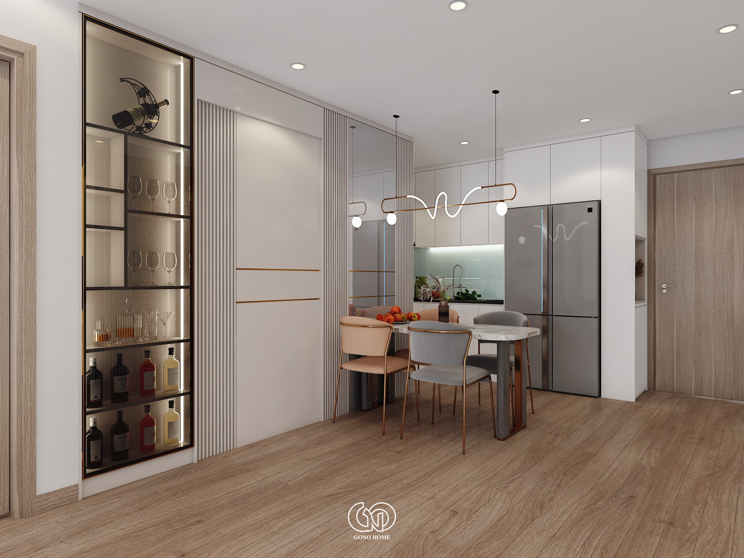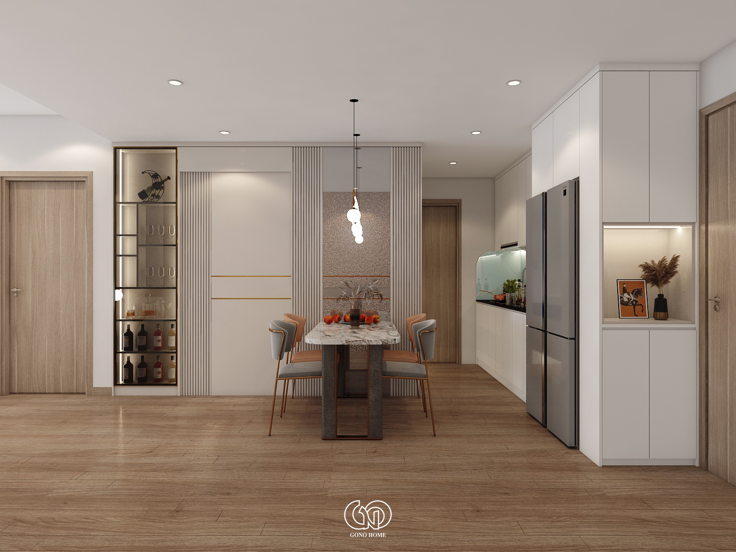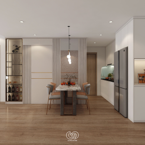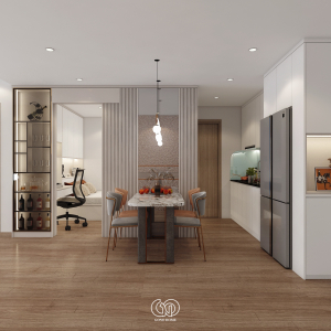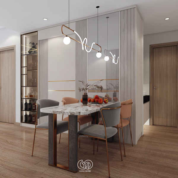 Bàn ăn được đặt ở vị trí trung tâm, nổi bật với: Mặt bàn đá vân mây sang trọng, ghế ăn phối màu tinh tế (xám – cam), đèn thả trần thiết kế uốn lượn độc đáo. Phía sau bàn ăn là vách trang trí lam sọc kết hợp kính và tủ rượu âm tường, giúp tăng chiều sâu không gian và tạo điểm nhấn cao cấp.