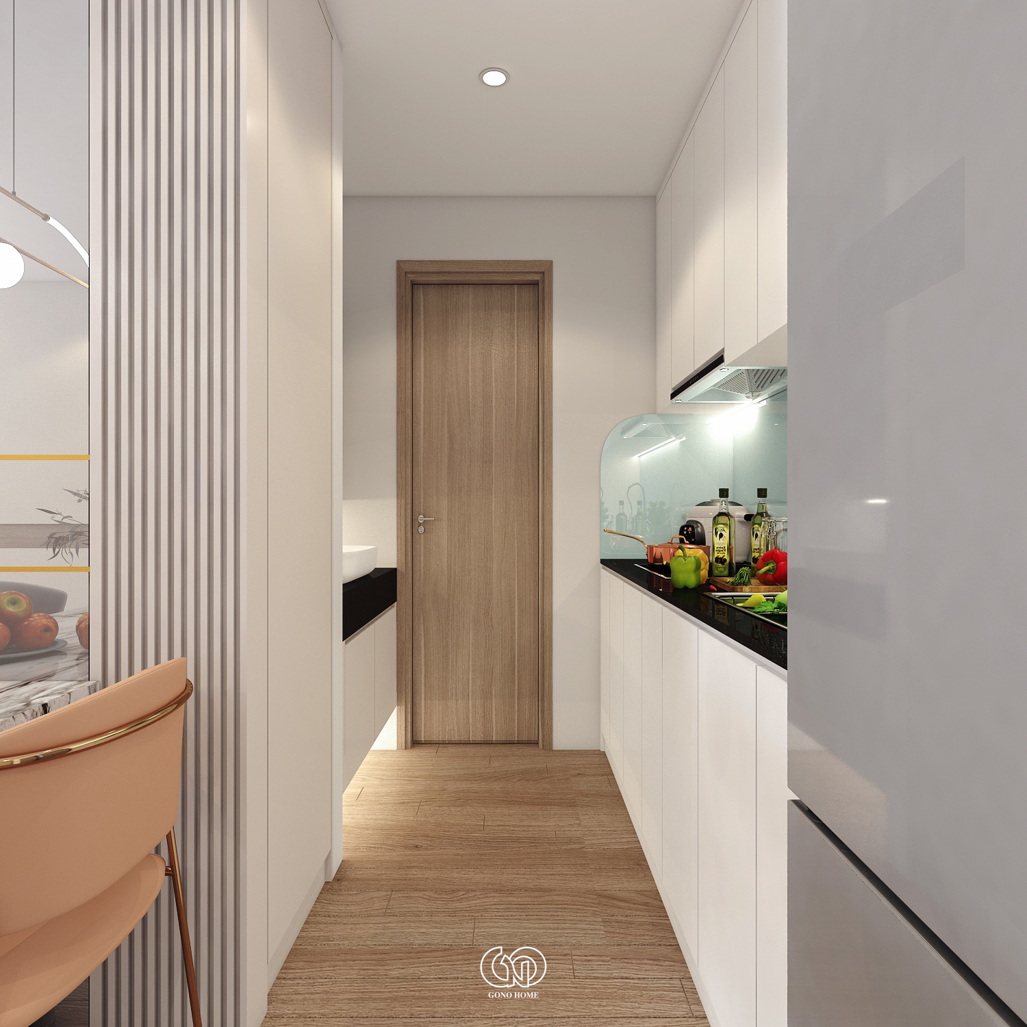 Không gian bếp được thiết kế liền kề: Tủ bếp trên dưới tối giản, gam màu trắng giúp mở rộng không gian, bố trí khoa học, thuận tiện di chuyển. Đây là giải pháp tối ưu cho căn hộ có diện tích vừa và nhỏ.