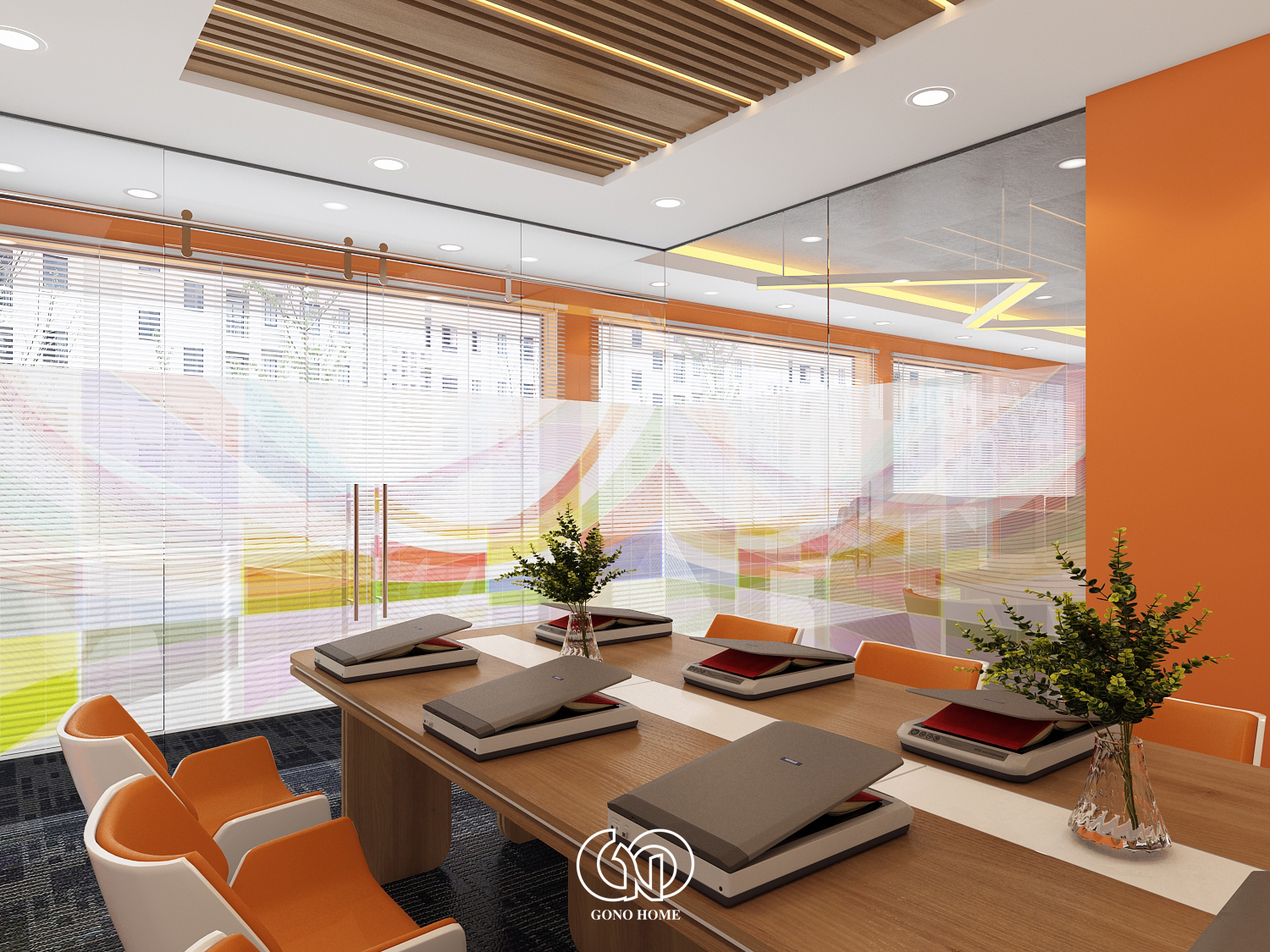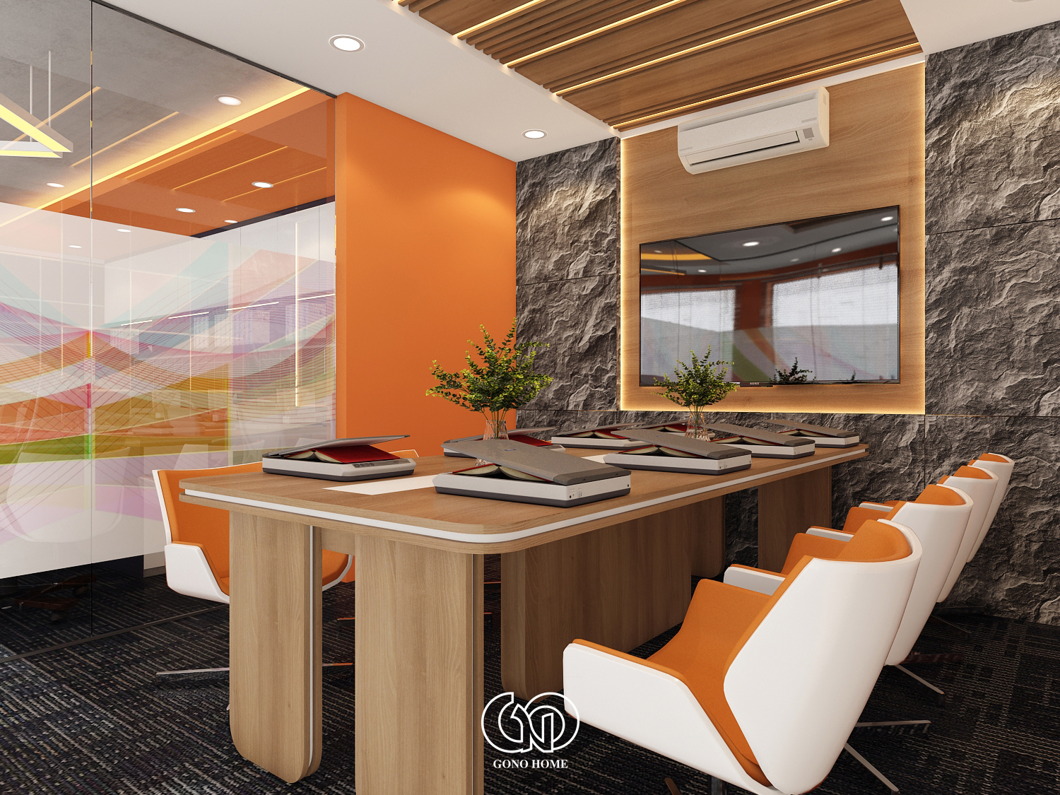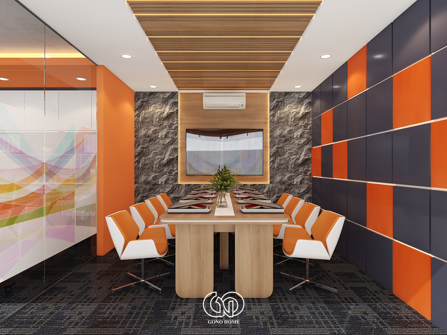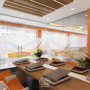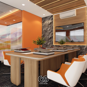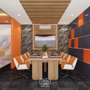 Phòng họp được thiết kế nổi bật với:Trần lam gỗ hiện đại, tường đá tạo điểm nhấn sang trọng, bàn họp dài kết hợp ghế màu cam trắng đồng bộ